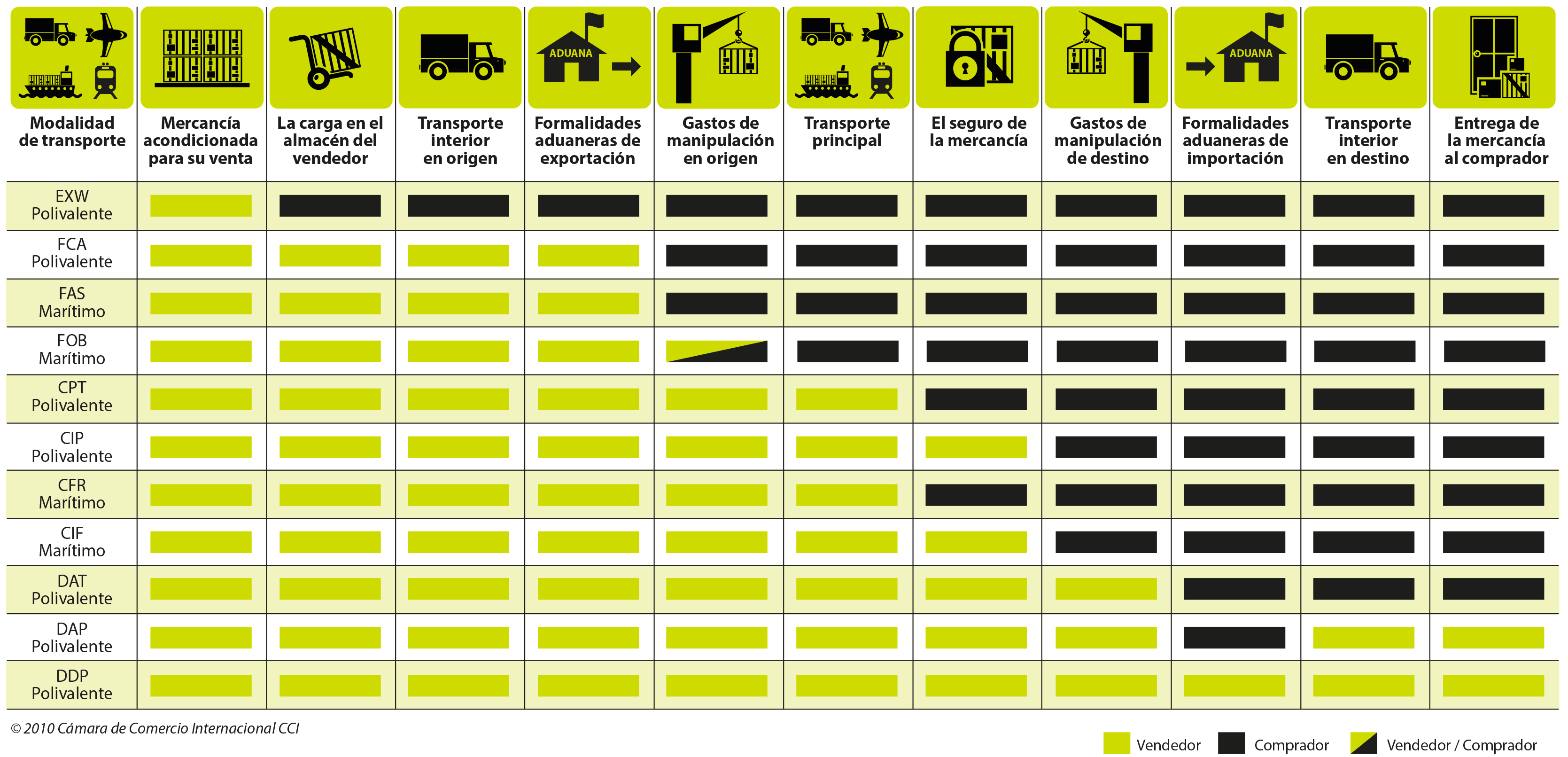 The current Incoterms are those published by the International Chamber of Commerce in 2010. They include 11 categories and in each one of them it is established who pays for the transport, where the goods are delivered, who is in charge of the customs expenses, among other things.